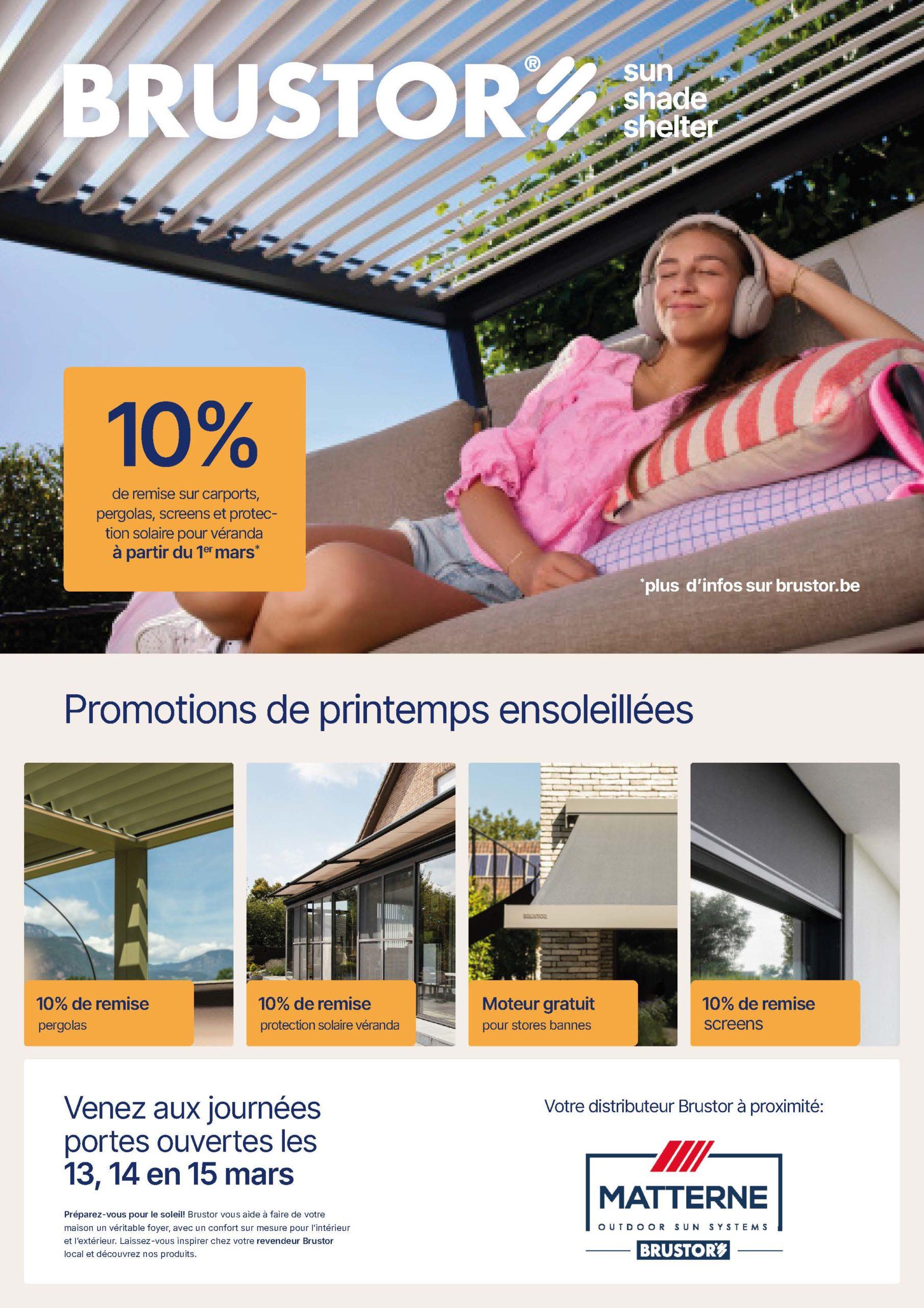 Découvrez les conditions de printemps Brustor sur les pergolas et les protections solaires (store banne et screens) en feuilletant le folder des actions.